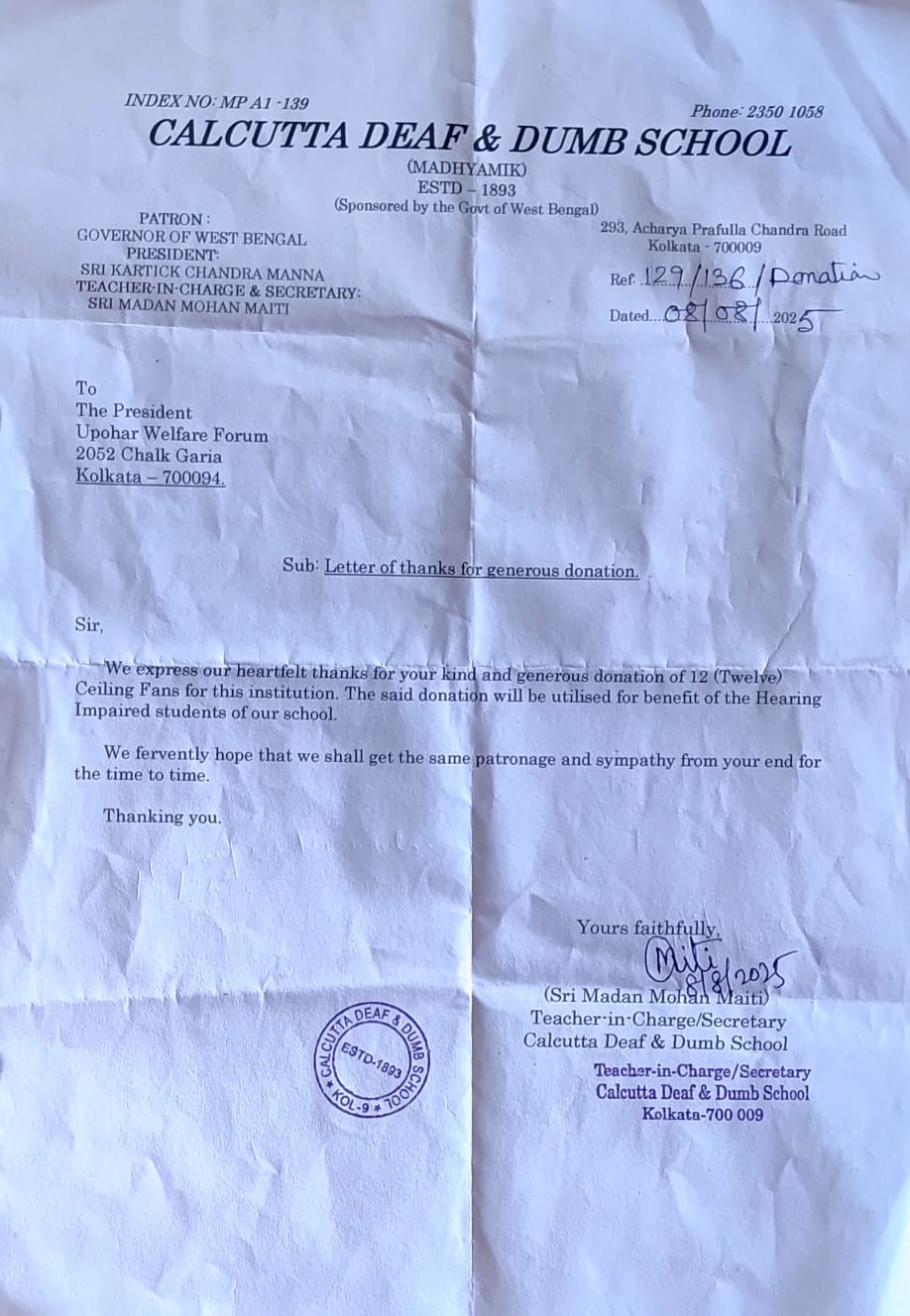 Donation of 12 Celling Fans for Calcutta Deaf & Dumb School